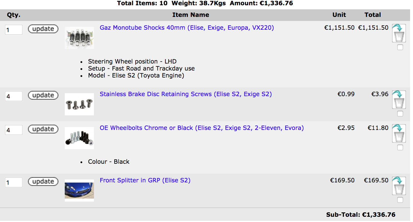 Jag håller på med en beställning av stötdämpare, beställer troligen från https://www.elise-shop.com, dom har även splitter.