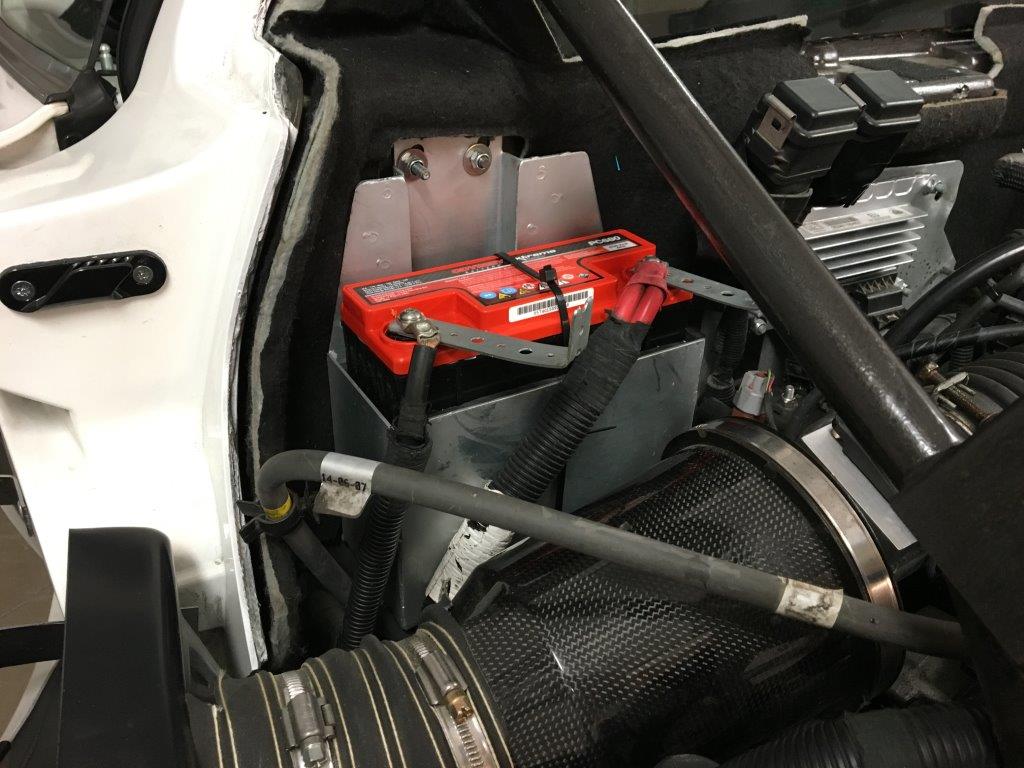 Nya bromsskivor EBC Ultimax kom på plats runt om inför förra säsongen och då även nya belägg CL Brakes RC5+ som bettar otroligt fint, även kalla. En del som använt dessa har upplevt att de kan smulas sönder, men mina har hållit väldigt fint över två säsonger med ca 1500 mil körning och 5 dagar med bankörning. Finns hur mycket som helst kvar på beläggen och de sliter inte heller skivorna nämnvärt. Ett nytt Odyssey racingbatteri införskaffades och flyttades fram till brandväggen, där det fanns plats sedan originalluftburken sedan länge fått ge plats till ett Hurricane Kolfiber luftfilter. Fick hjälp av en mekanisk verkstad att bygga själva lådan i aluminium så att den passade i de gamla fästena för luftfiltret, som bultas inifrån kupén bakom plastpanelen som täcker brandväggen. En positiv biverkan är att bagageutrymmet förvandlades nästan till kombiklass (nåja...) när batteriet försvann därifrån. Batteriet behöver då heller inte tas bort när bakskalet ska av, vilket annars måste göras.