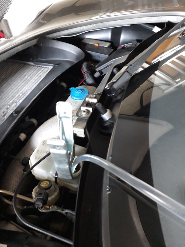 Man tar en lång vanlig genomskinlig 6 mm slang (köpte på Bauhaus), sätter ena ändan på bromsnippeln och sänker ner den andra änden i vätskan i behållaren där framme. Sedan öppnar man upp nippeln på samma sätt som vanligt, och trampar ner bromspedalen en massa gånger så att all vätska cirkulerar runt. När man har gjort detta i varje hörn i rätt ordning så finns det garanterat inga bubblor kvar, de löses upp i vätskebehållaren. OBS viktigt att systemet förblir slutet, jag säkrar slangen i behållaren med en vanlig snickeriklämma.