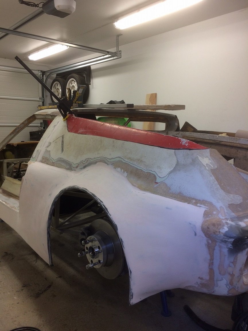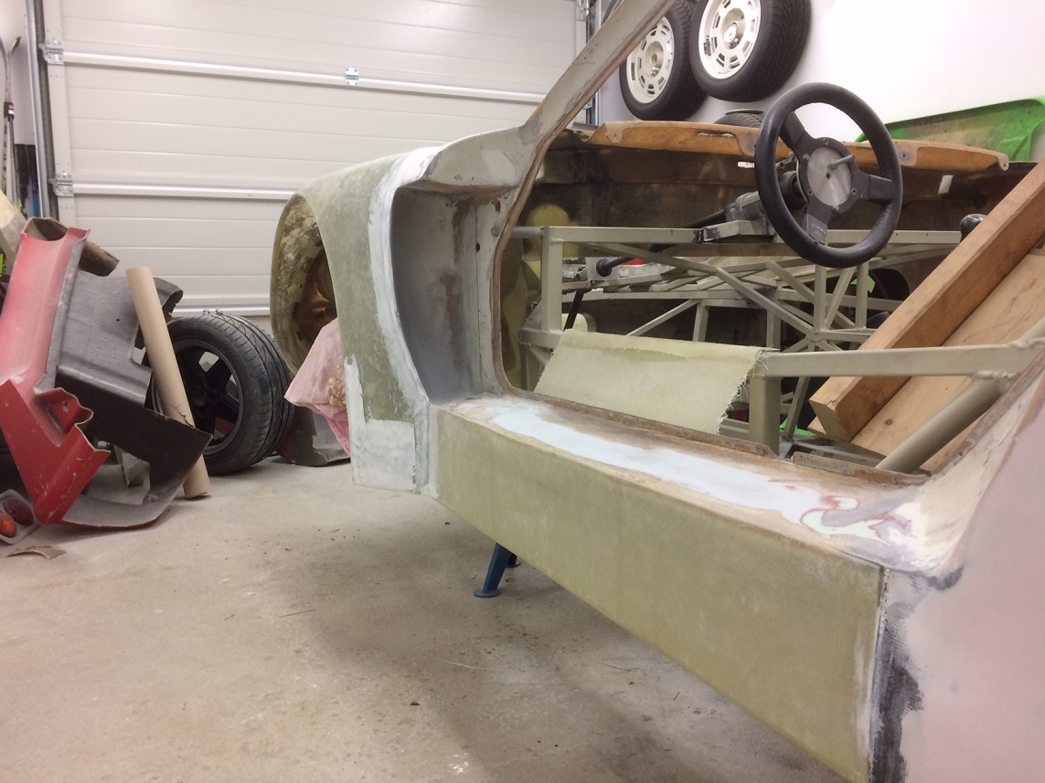 Här har inte hänt så mycket men har i alla fall plastat dit kjolen, ett par lager glasfiber till på baksidan sen kan det spacklas lite.
