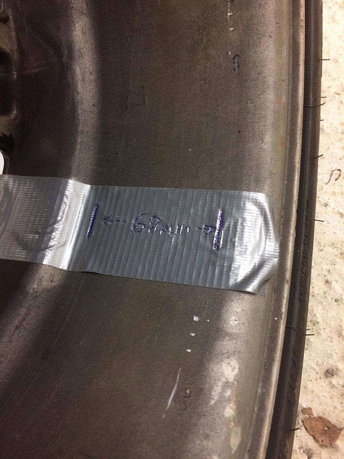 linjen mellan spindelns övre och undre fäste så landar jag ca 68mm från centrum på fälgbanan, se bild.