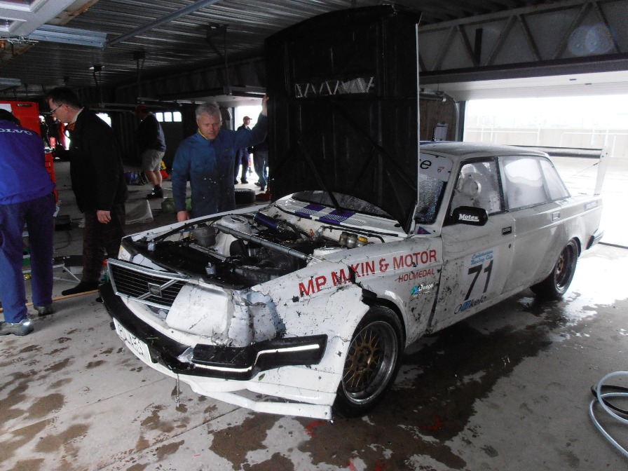 WET RACE! Regn och snorhalt hela dagen på Falkenberg. Redan efter en halvtimme vattenplanade vår startman rakt in i däckbarriären i Ginstkurvan. Men i långlopp får man inte ge upp så lätt! Vi fick räta ut en del plåt, göra en ny framskärm av silvertejp och lite återstående plastbitar samt ställa in framvagnen på måfå. Det tog en knapp timme men sedan höll det ända in i mål, om än bara på en 20:e plats. Många bilar såg ganska tilltufsade ut efter denna blöta tävling, men det hinner nog fixas till nästa race på Sturup den 11 augusti.
