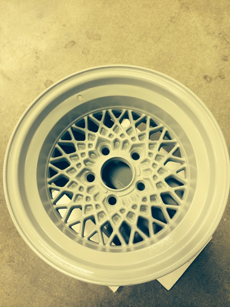 Bakfälgarna nu glasblästrade och epoxigrundade