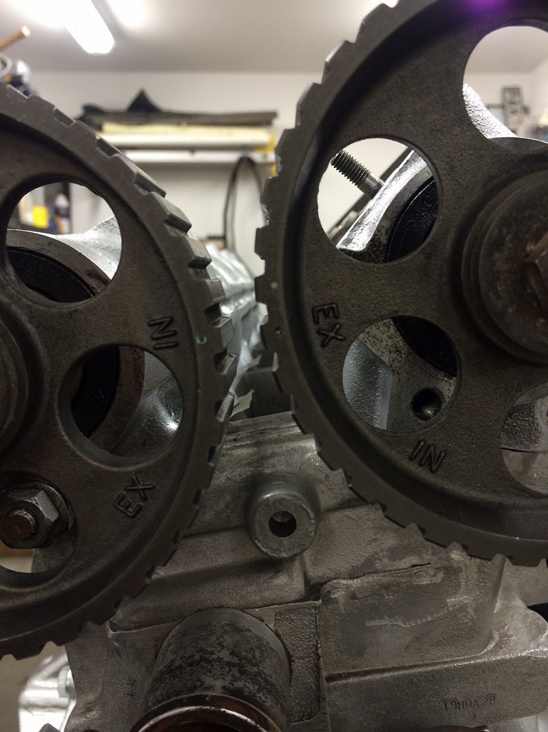 På drevet till kamaxeln på avgassidan finns både en vit och en grön markering, på drevet till kamaxeln på insugsidan bara en grön.