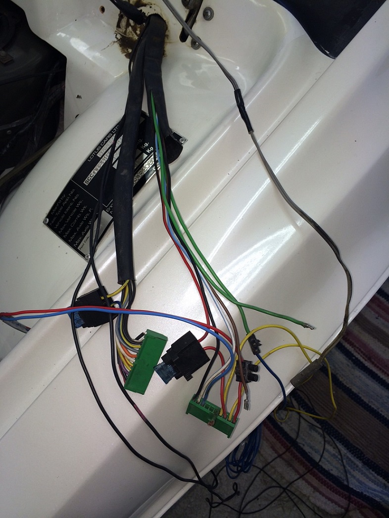 På vänster sida finns en grå plastpåse dit det går två kablage (se överst till höger på bilderna nedan) som samlas i två gröna kontakter.