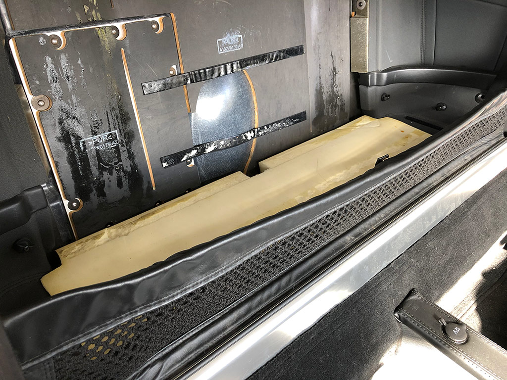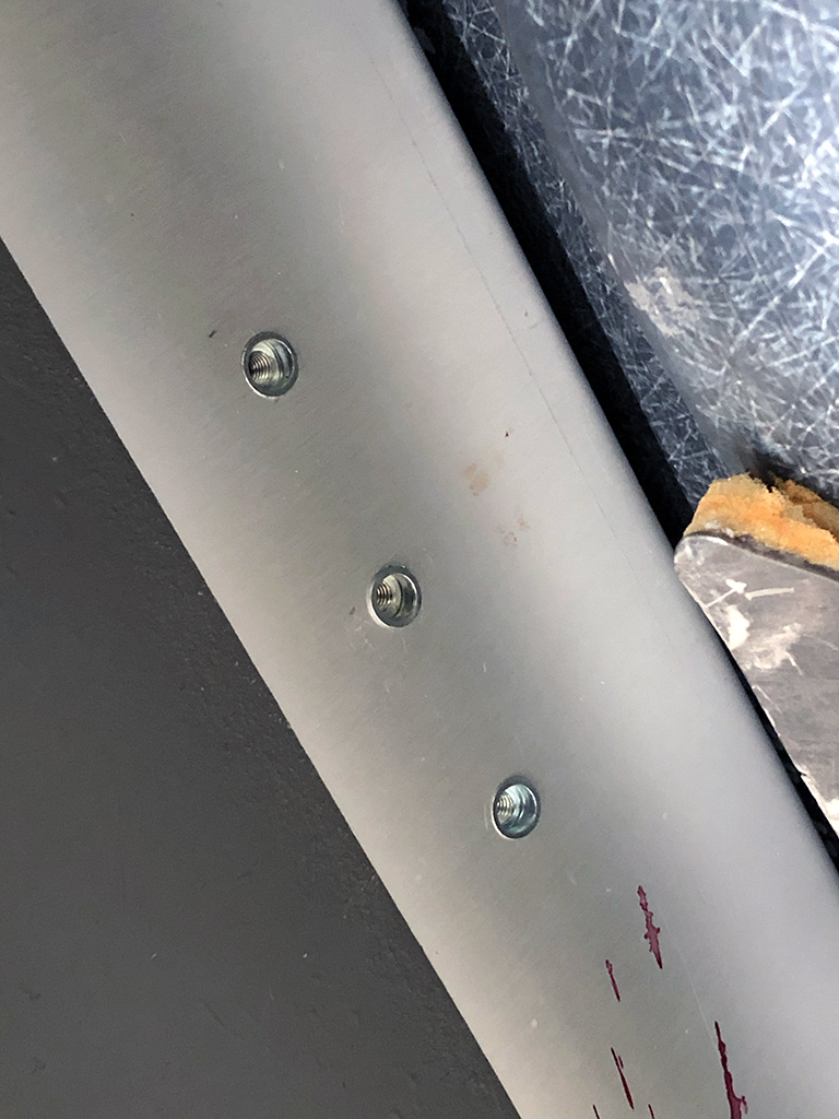 Ut med stolarna, bort med mattorna bak. Borra tre hål och montera tre blindnitmuttrar.