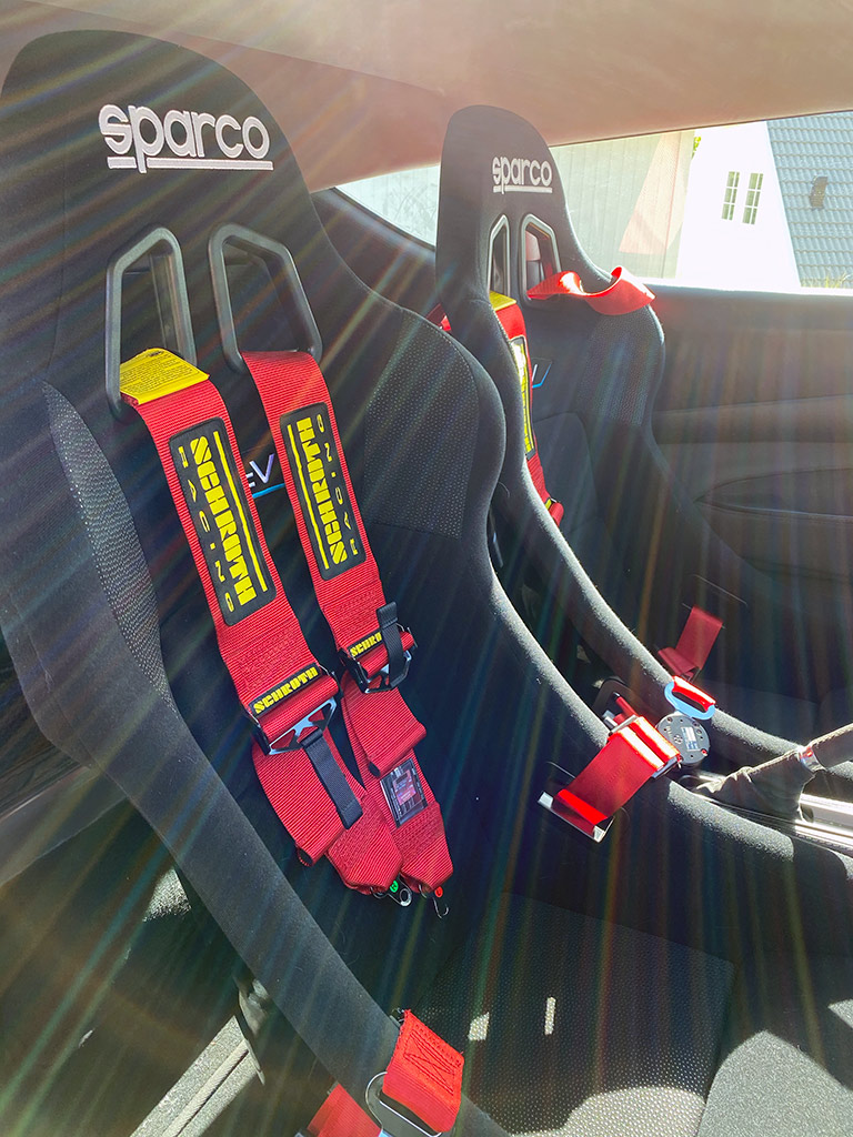 Stolarna var lite mer omständiga att få på plats. Det är inte heller nödvändigt att byta stolar, det går bra att installera 4-punktsbälte till originalstolarna också. Det enda som behöver göras då är att borra ett hål i underredet, mot mittkonsolen, för att fästa midjebältet. Alla skruvar och brickor finns med i installationsmaterialet. Jag hade tänkt köpa Sparco Evo, då det var de stolarna som Lotus Motorsport sålde en gång i tiden till Evora. Men de var slut i lager och fabriken är stängd pga COVID-19. Istället köpte jag två Sparco Rev som är snarlika Evo. Värt att tänka på är att Evo finns i tre olika storlekar, Rev bara i en. Jag köpte även golvfäste från Sparco, i aluminium. Så långt, allting väl. Det är gott om plats i Evora för stolar. Dock stämmer inte hålbilden för golvfästena från originalstolarna. Jag har valt att montera stolarna fast i golvet då det bara är jag som kör bilen. Efter att ha hittat rätt läge fick jag modifiera hålen på golvfästena, de mot mittkonsolen, genom att göra de avlånga hålen lite större. Dessutom behövde de bakre fästena i själv golvet justeras genom att borra ett nytt hål och vända på den mutterbricka som sitter undertill. Svårt att förklara i text, och jag insåg efteråt att jag inte tagit några bilder. Jag fick även beställa ett par fingängade M10 för att kunna montera originalbälte ihop med fyrpunktsbälte på dessa underrede.