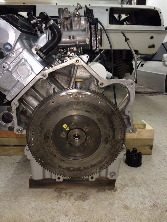 Fick kåpa (vid utg. vevaxel), svänghjul och kamrem på plats