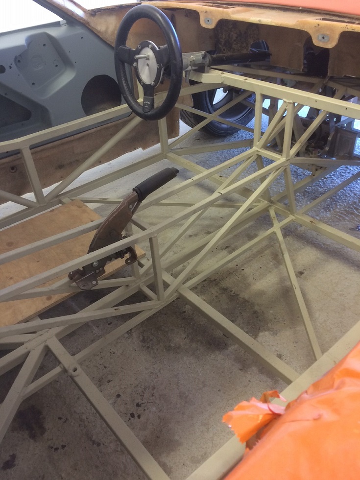 Har börja demontera karossen och satt upp chassiet på pallbockar
