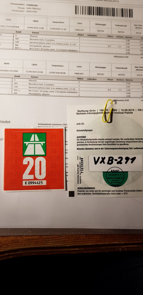 Köpta båtbiljetter samt ett tysk miljömärke och en schweizisk motorvägsdekal. Hoppas att Korona är över i september.